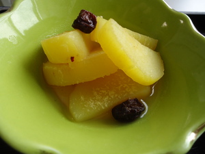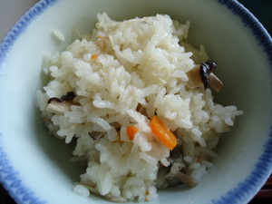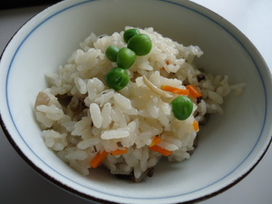 ・吹き寄せごはん ・鶏肉の照り焼き ・カニカマ入り酢の物 ・味噌汁 ・さつま芋の甘煮 ・奈良漬