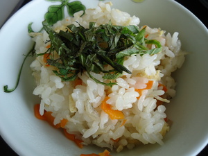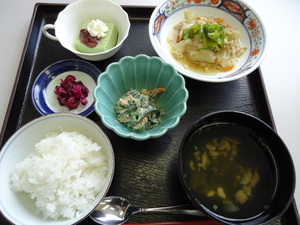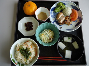 11月の献立紹介(o^∇^o)ノ 2013年12月26日 ・じゃこと青じそのご飯 ・鶏肉の照焼き ・春雨サラダ ・はんぺんのお吸物 ・みかん ・奈良漬 ・ご飯 ・豚肉と野菜の炒め煮 ・コンニャクと人参の白和え ・清し汁 ・抹茶ミルクゼリー ・しば漬