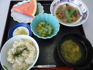 じゃこと青じそのごはん・牛肉と野菜の煮物・おろし和え・すまし汁(えのき・蒲鉾)・すいか・奈良漬