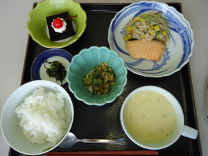 ごはん・鮭のチャンチャン焼き・小町和え・コーンスープ・コーヒーゼリー・昆布の佃煮
