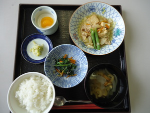 ごはん・厚揚げと豚肉の味噌炒め・ほうれん草のしらす和え・竹輪のお吸い物・杏仁豆腐・白菜漬