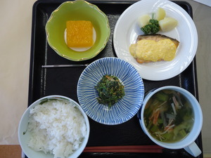 ◆ 白ごはん 鮭の和風ムニエル ミルク煮 ハムとレタスのスープ リンゴ寒天 ◆