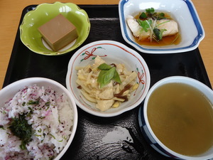 ◆ かしわ飯 豚肉のおろし焼き 白菜のおひたし すまし汁(豆腐わかめ) ブトウ寒天 ◆