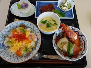 ◆ 6月はアジサイ御膳 ウナギや炊き合わせ、茶わん蒸しもついて、豪華な昼食ですね。