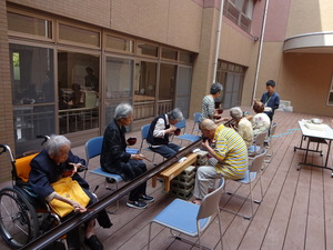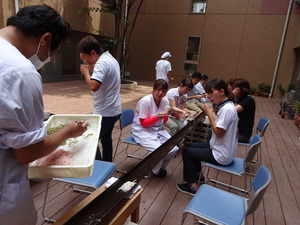 中庭では手作りのそうめん流しを楽しみました。