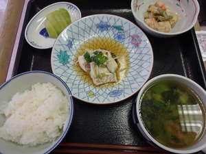 かしわ飯 豚肉の生姜焼き 千草蒸し 鰯のつみれ汁 パイン寒天