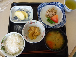 ごはん 豚肉の葱ソースかけ 鶏肉と筍の煮物 だご汁 りんご