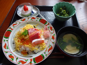3/3雛祭りの御膳 (お刺身とイクラの豪華チラシ、ハマグリのすまし汁、菜の花のおひたし、デザート)