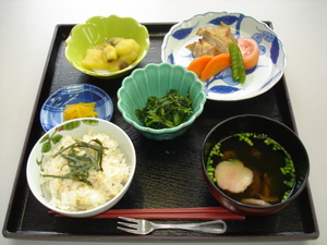 鯛めし 鶏肉の味噌漬け焼き ほうれん草の胡麻醤油和え 清し汁 さつま芋の甘煮 生姜のみそ漬け
