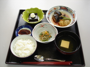 ご飯 魚の昆布巻き もやしと春菊のごまあえ 卵豆腐のお吸い物 コーヒーゼリー 奈良漬
