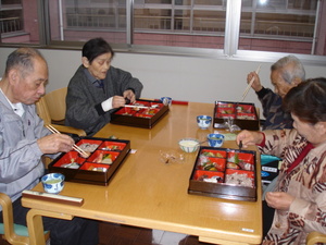赤飯 刺身 お煮しめ 白菜のごま醤油かけ 伊達巻 紅白なます 数の子 黒豆 干し柿 苺の牛乳寄せ 清し汁