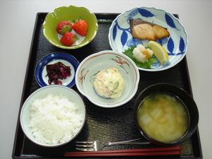 ご飯 魚のつけ焼き ポテトサラダ 味噌汁 イチゴ しばずけきくらげ