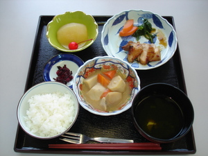 ご飯 鶏肉の梅照り焼き 里芋のみそ煮 清し汁 コンポート しばずけきくらげ