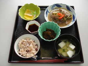 ☆ ・赤飯 ・牛肉といんげんの炒め煮 ・もずく ・はんぺんのお吸い物 ・アップルゼリー