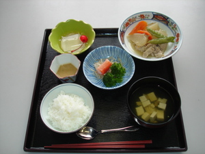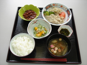 ☆ ・ご飯 ・蒸し豚の薬味ソースかけ ・みかんと胡瓜の卸合え ・のっぺい汁 ・煮豆