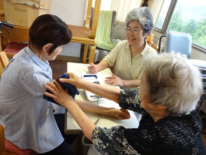 体操前に血圧を測るお手伝い。プロの看護師さんみたいですね。