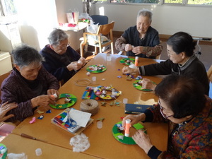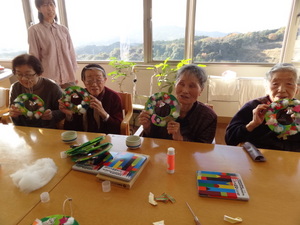 ★ レクレーションでクリスマスリースを作りました。折り紙や綿、はぎれ布などを貼り付けました。