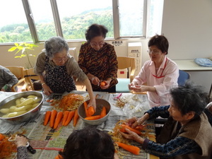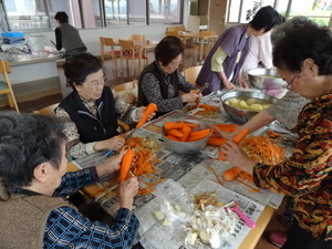 前日のクッキングクラブでは、カレー材料の切込みを手伝いました。翌日のバザーの話で盛り上がりました(^▽^)/