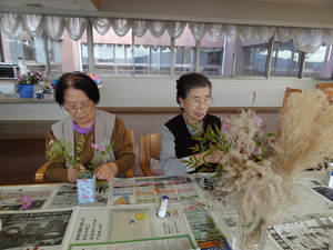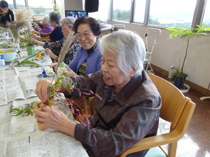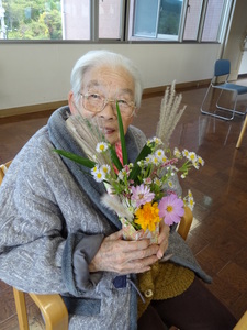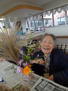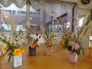 大地周辺を散歩し、野花やススキを取ってきて皆様に生け花をして頂きました。